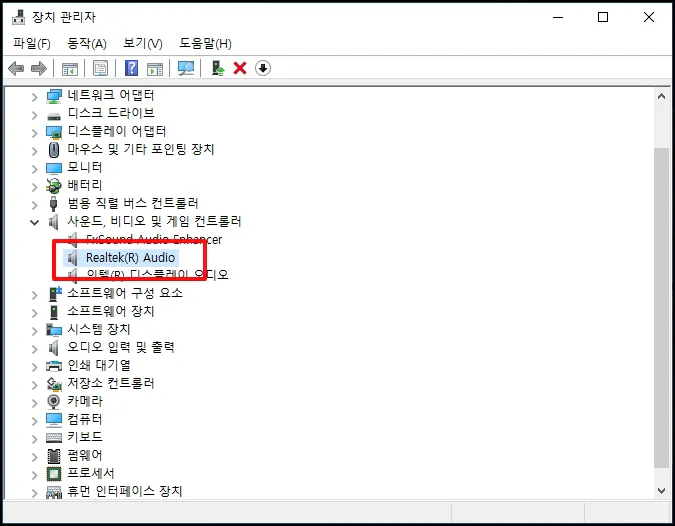 장치 관리자 창이 나오면 [사운드 비디오 및 게임 컨트롤러]를 클릭하여 하위를 확장합니다.