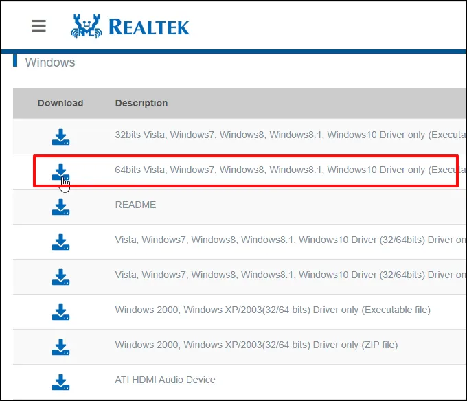Realtek 사이트에 접속 후 사용하는 최신 드라이버를 선택합니다.