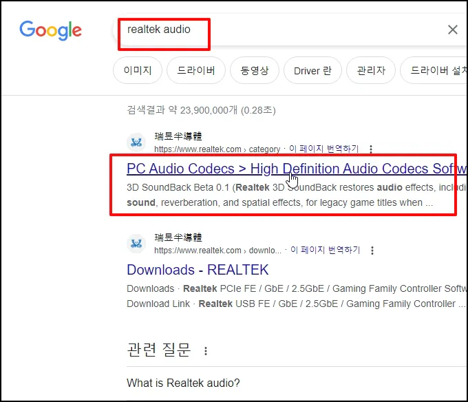 구글 사이트에서 "realtek audio"를 검색합니다.