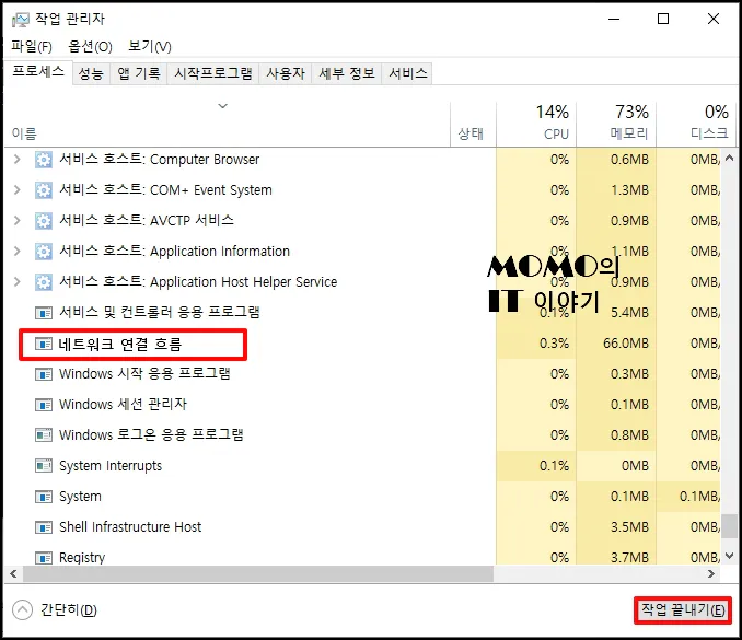 프로세스 항목들이 나오는데요. 이름 중 [네트워크 연결 흐름]을 선택 후 [작업 끝내기]를 선택합니다. 창을 닫고 [다음] 버튼이 활성화돼서 나오게 됩니다.