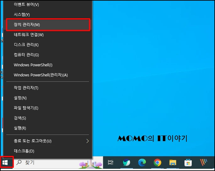 윈도우 시작 버튼에서 마우스 오른쪽 버튼을 클릭합니다. 메뉴가 나오면 [장치 관리자]를 선택합니다.
