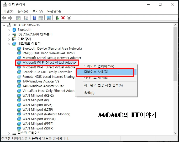 숨겨진 장치가 보이는데요 [네트워크 어댑터]아래 [Microsoft WiFi- Direct Virtual Adapter]에서 마우스 오른쪽 버튼