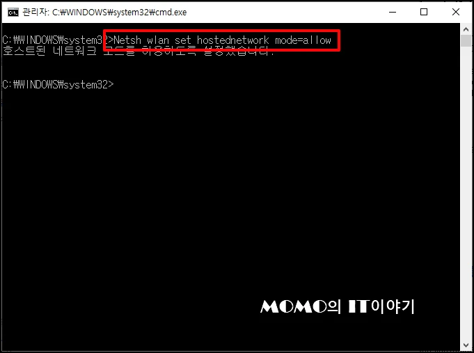 다만 이 기능을 사용할 때 "netsh wlanstart hostednetwork" 명령어를 입력하게 됩니다.