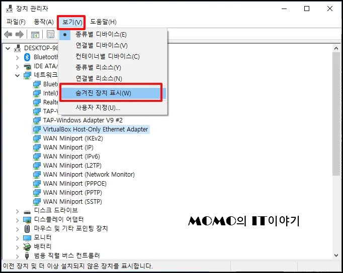 장치 관리자 창이 실행하면 상단 메뉴 중 [보기]를 클릭 후 하위 메뉴에서 [숨겨진 장치 표시]를 선택해 주세요