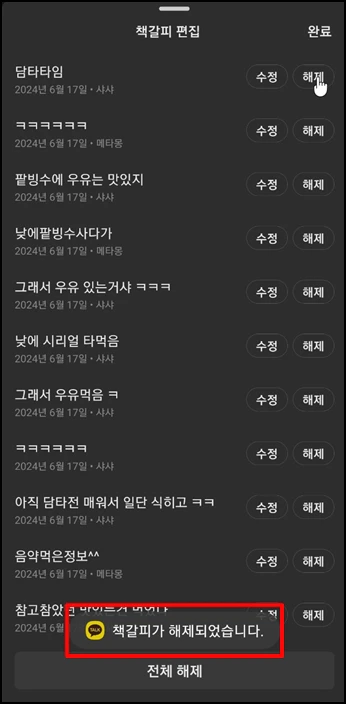 해당 책갈피가 삭제되고 화면 하단에 "책갈피가 해제되었습니다."라고 메시지가 나옵니다.