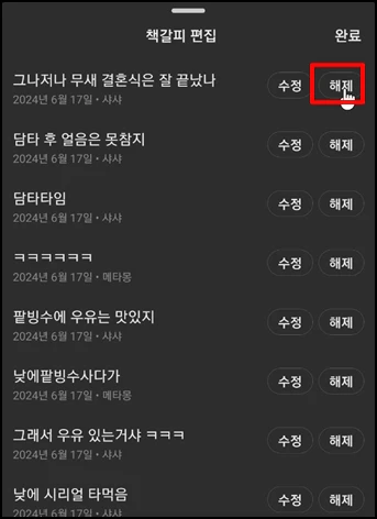 이렇게 등록된 책갈피가 많은 경우 해제하여 목록에서 삭제할 수 있는데요 우측 [해제]를 선택합니다.