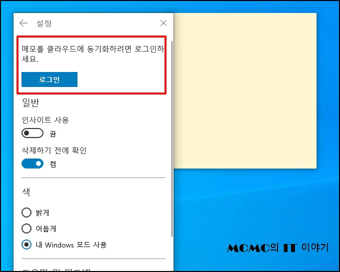 윈도우에서 메모나 OneNote 데스스탑을 사용하면 마이크로소프트계정에 자동 로그인됩니다.