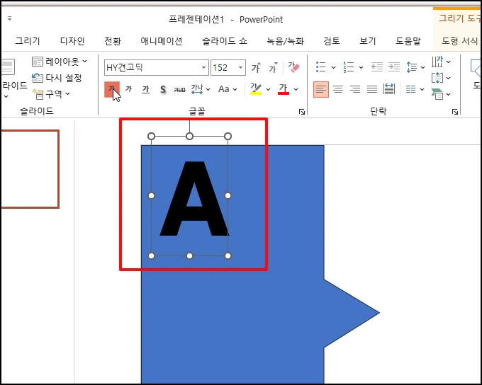 하나의 도형이 되었습니다. 글자를 삽입하기 위해 [삽입]-[글상자]를 선택합니다