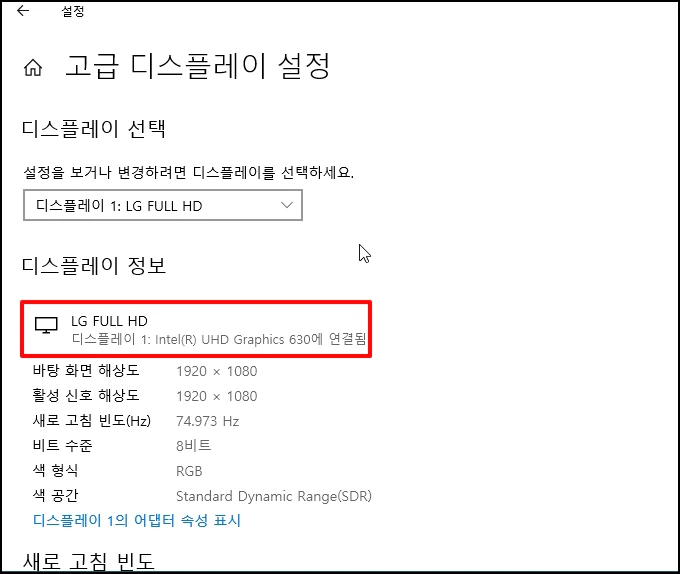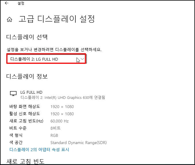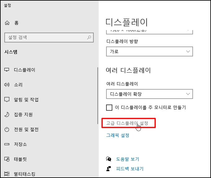 디스플레이 창이 열리면 스크롤을 내려 [고급 디스플레이 설정]을 선택합니다.