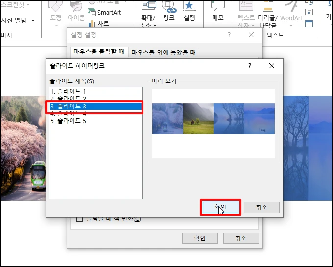 [하이퍼링크]-[슬라이드] 선택 하이퍼링크 창이 열리면 [3. 슬라이드3]을 선택 후 [확인] 버튼을 클릭합니다.