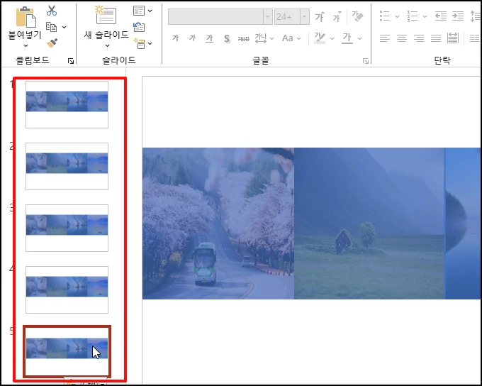 슬라이드를 선택 후 "Ctrl + C" 키를 눌러 복사 후 "Ctrl +V" 키를 4번 눌러 붙여넣기를 4번 합니다.