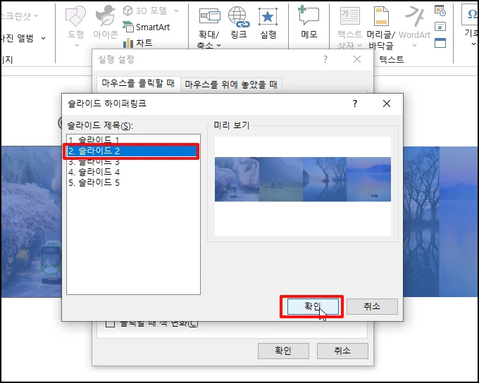 슬라이드 하이퍼링크 창이 열리면 [2. 슬라이드2]를 선택 후 확인 버튼을 클릭합니다.