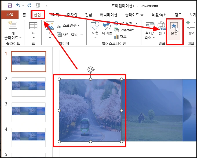 첫 번째 슬라이드에서 첫 번째 사각형을 선택 후 상단 메뉴 중 [삽입]을 선택 후 하위 메뉴에서