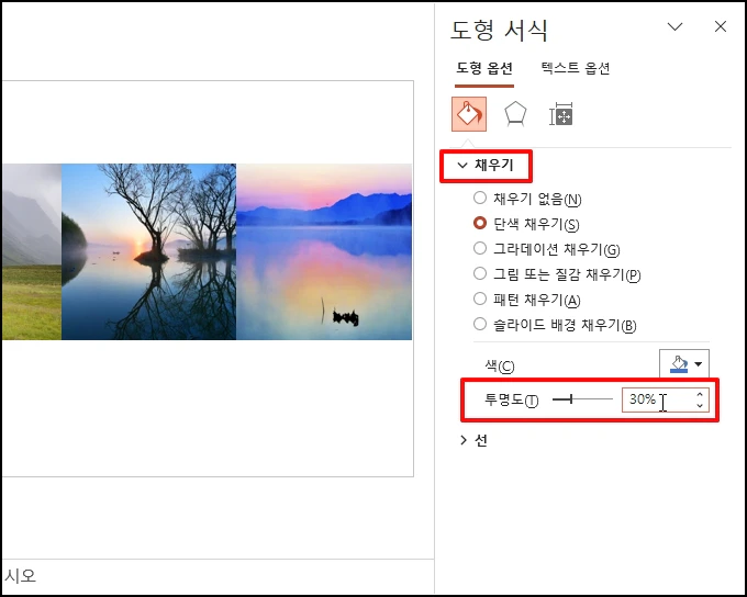 도형 서식이 우측에 나오면 [채우기]-[투명도]를 "30%"로 설정합니다.
