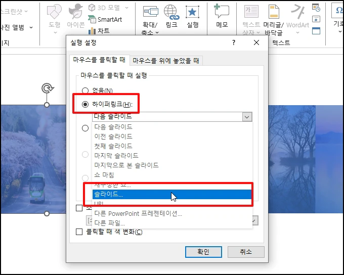 같은 작업인데 실행 설정 창이 열리면 [하이퍼링크]를 선택 후 [슬라이드]를 선택 후
