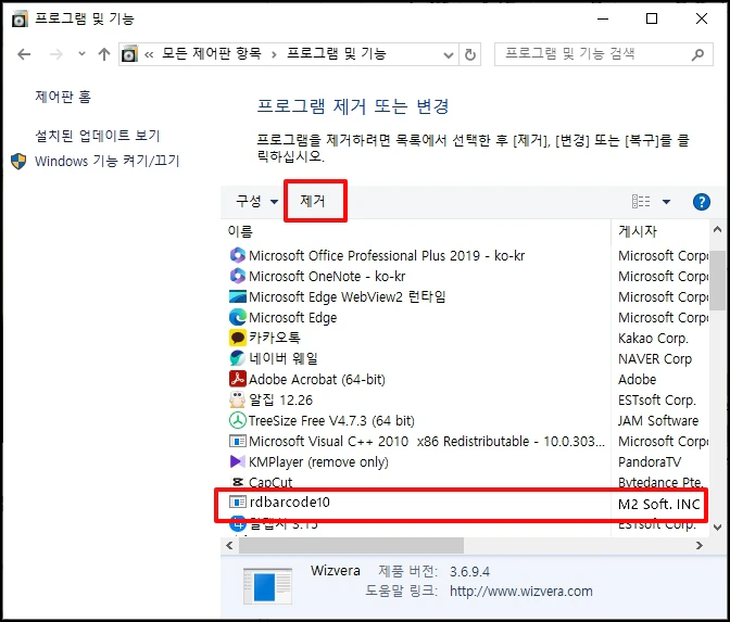 프로그램 및 기능 창에서 rdbarcode10를 찾아 [제거]를 클릭해서 삭제하시면 됩니다.