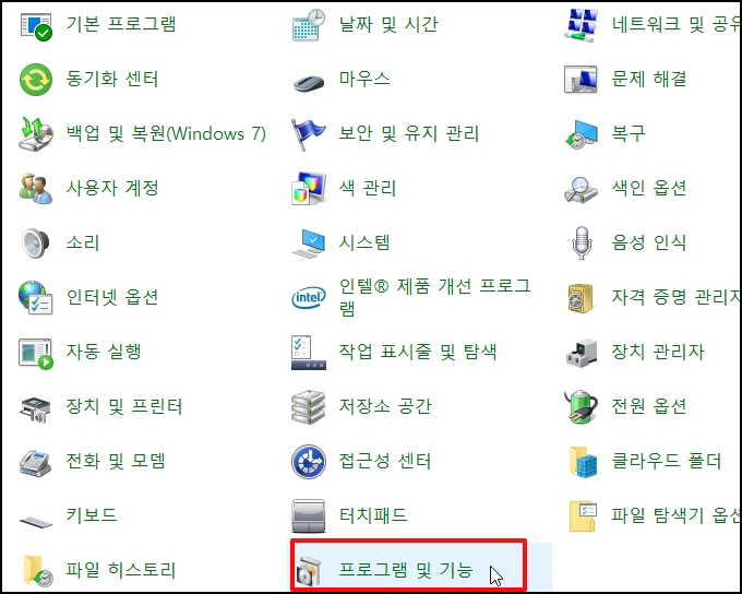 제어판이 실행되면 [프로그램 및 기능]을 선택합니다