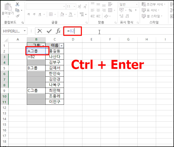 "=B2"를 입력 후 "Ctrl + Enter" 버튼을 클릭합니다.