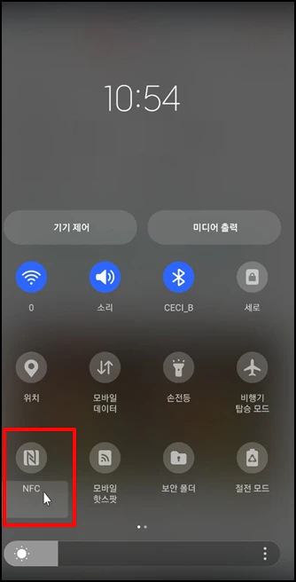 상단 바를 내려 [NFC]를 비활성화합니다.