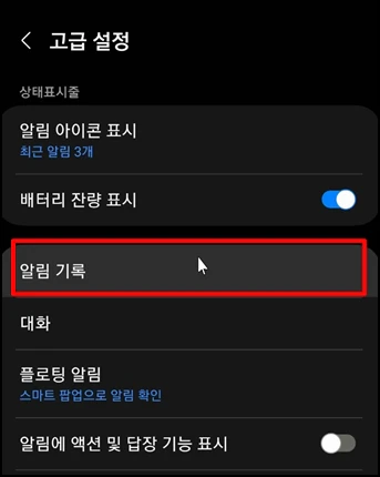 고급 설정 화면으로 이동하면 [알림 기록] 또는 [최근 알림]을 선택해 주세요
