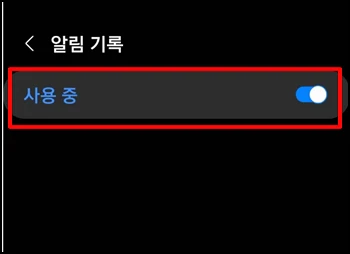 알림 기록이 없는 경우 [사용 중]을 켬으로 해서 활성화 하고 알림이 다시 오면 확인합니다.