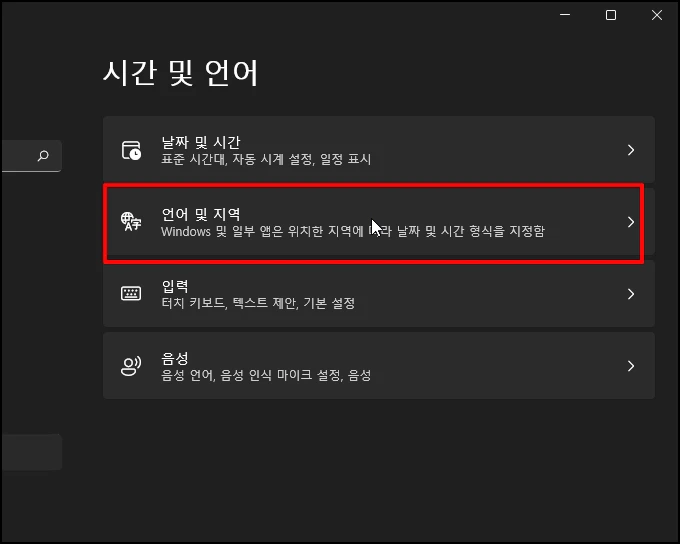 우측 시작 및 언어 화면으로 이동하면 [언어 및 지역]을 선택합니다.