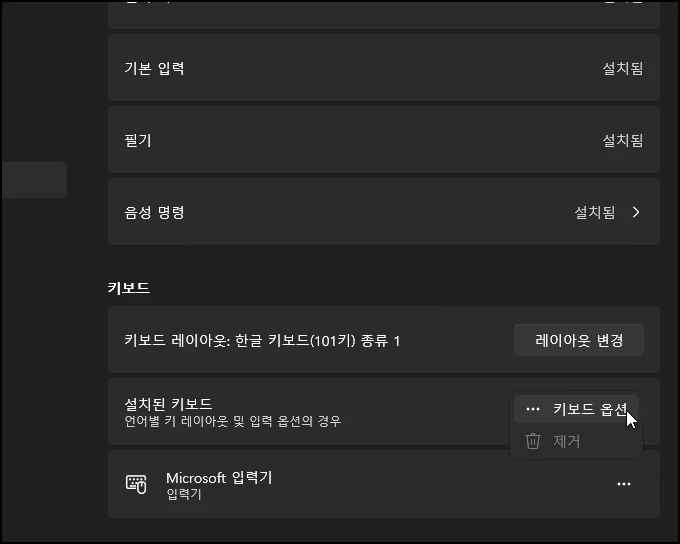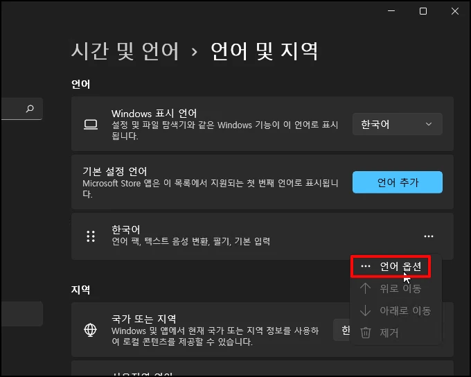 언어 및 지원 화면 언어에서 [한국어] 우측 끝에 점 3개의 메뉴가 있습니다. 클릭하시고