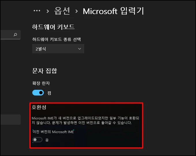 입력기 속성 창이 열리면 [호환성]에 [켬]으로 선택해 주시면 됩니다.
