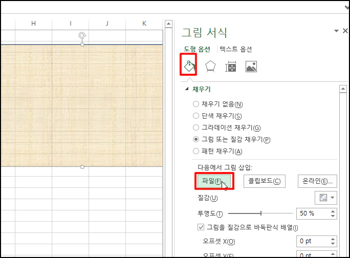 도형 서식 참바가 나오면 [파일] 버튼을 클릭합니다.