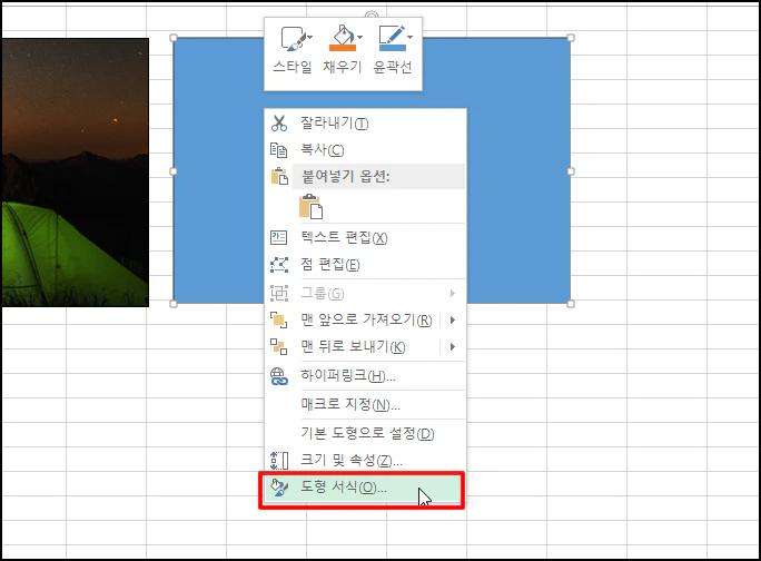 이제 사각형에서 마우스 오른쪽 버튼을 클릭 후 메뉴가 열리면 [도형 서식]을 선택합니다.