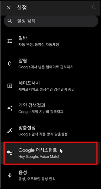 메뉴 중 [Google 어시스턴트]를 선택해 주세요
