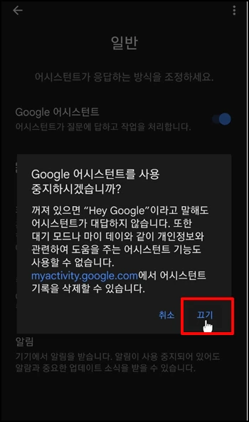 Google 어시스턴트 사용을 중지하시겠습니까? 메시지가 나오면 [끄기]를 선택하시면