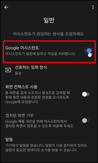 일반화면에서 [Google 어시스턴트]가 켜져 있을 텐데요 [끔]으로 선택합니다.