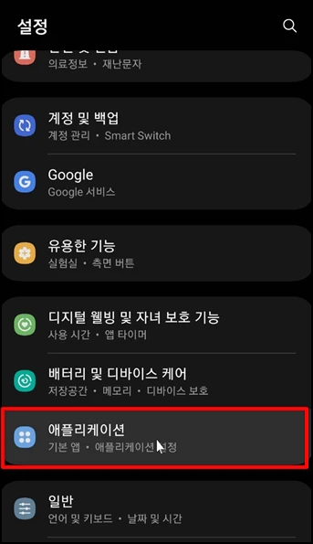 홈버튼을 누를 때 실행되는 것을 중지하기 위해 설정 화면에서 [애플리케이션]을 선택합니다.