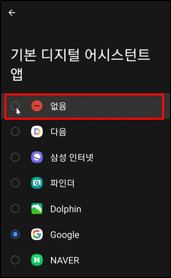 기본 디지털 어시스턴트 앱이 나오면 [없음]을 선택하시면 홈 버튼을 눌러도 실행되지 않게 됩니다.