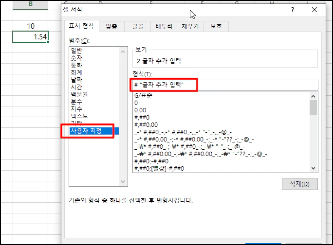 셀 서식 창이 열리면 좌측 범주 중 [사용자 지정]을 선택합니다.