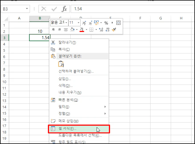 셀 선택 후 마우스 오른쪽 버튼을 클릭 후 메뉴 중 [셀 서식]을 선택합니다.
