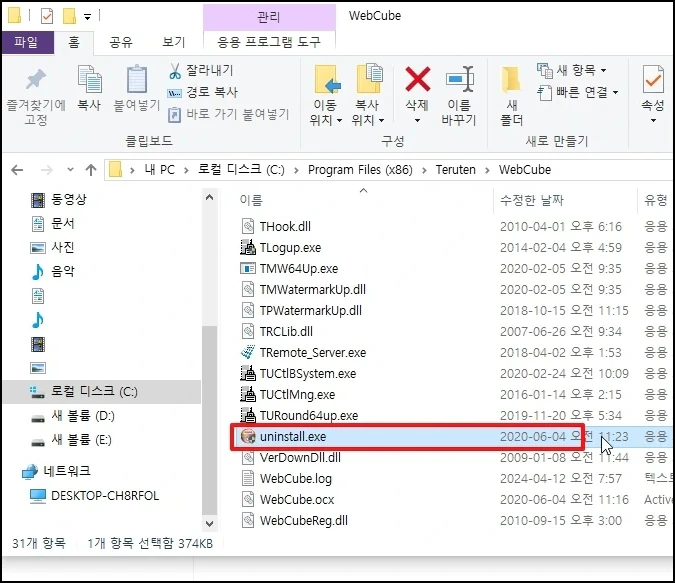 탐색기 실행 후 아래 경로로 이동해 "uninstall.exe"를 실행해서 제거하시면 됩니다.