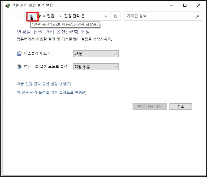 상단 주소 부분에 [전원 옵션]으로 가는 상단 메뉴로 가는 화살표를 클릭합니다.