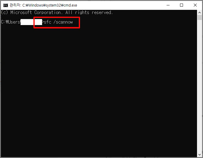 관리자 권한을 가진 명령 프롬프트 창이 열리면 아래 명령어를 입력 후 엔터키를 눌러주세요