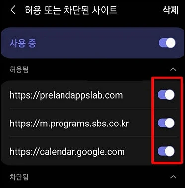 허용 목록 중 https://prelandappslab.co 와 같이 출처가 불분명한 사이트가 있다면,
