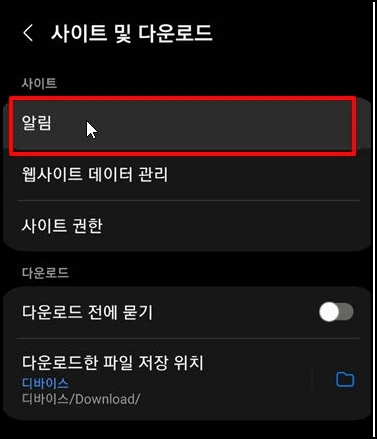 사이트 및 다운로드 메뉴 안에서 [알림] 을 선택합니다.