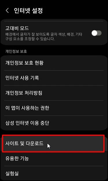 설정 화면이 열리면 중간쯤에 위치한 [사이트 및 다운로드] 항목을 터치합니다.