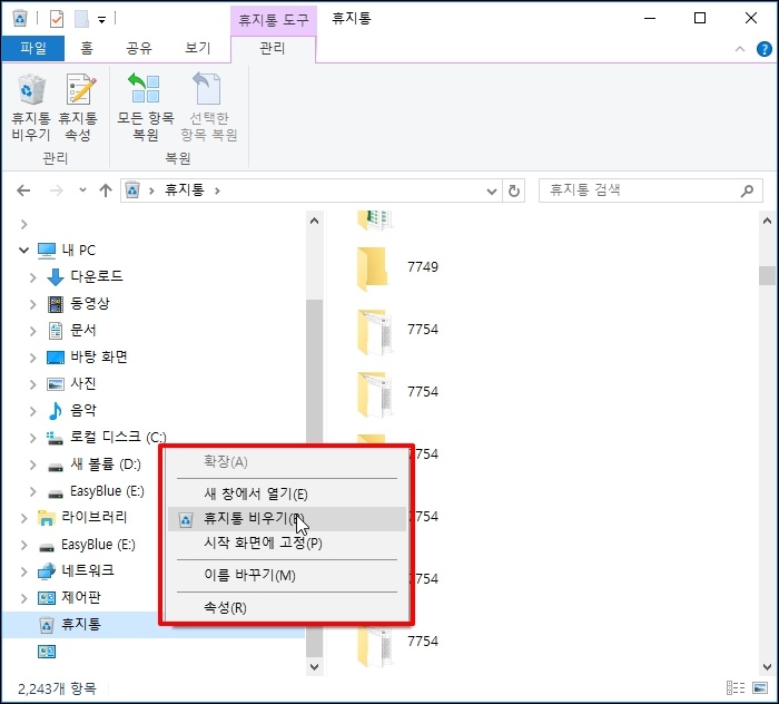 생성된 휴지통을 클릭하면 휴지통에 있는 폴더 및 파일이 조회되고 탐색기 휴지통에서 마우스 오른쪽 버튼을 클릭하면 휴지통 비우기를 포함한 메뉴가 나옵니다.