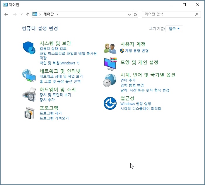 제어판을 클릭하게 되면 제어판 창으로 바로 이동하게 되는데요.