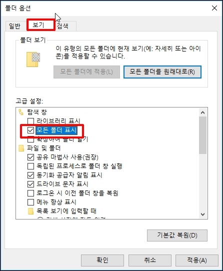 폴도 옵션 창이 열리는데요. 고급 설정 하위 [모든 폴더 표시에 체크]를 하시고 [확인] 버튼을 클릭합니다.
