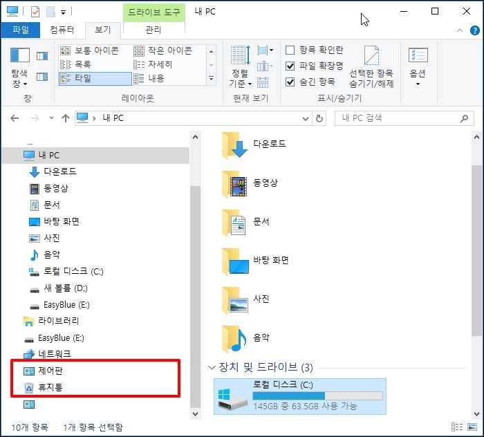 윈도우 10 탐색기에 휴지통, 제어판 추가, 제거하는 간단한 방법