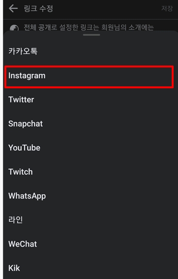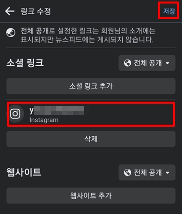 인스타그램이 추가되면 인스타 계정 입력 후 우측 [저장] 버튼을 눌러주세요.