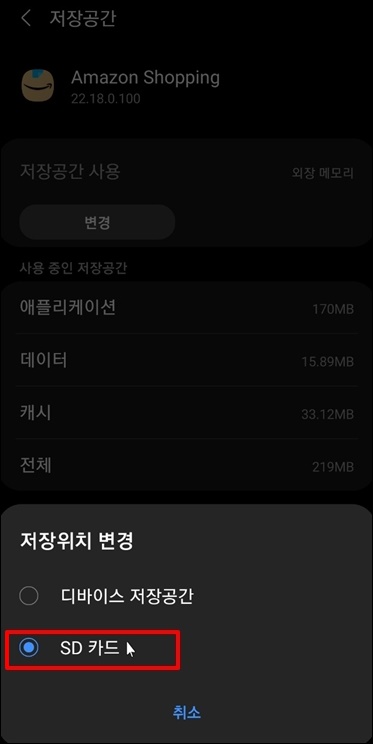 디바이스 저장공간이 내부 저장소인데요. sd 카드로 이동하기 위해 [sd 카드]를 선택합니다.