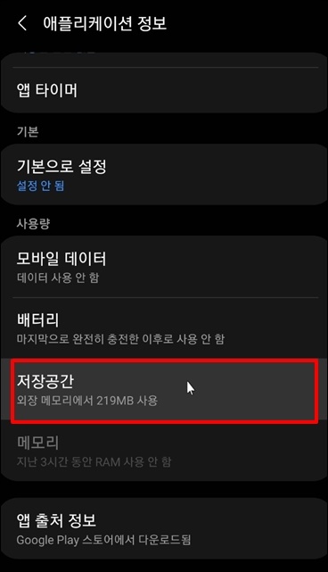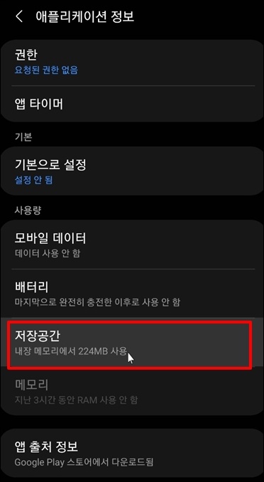 어플 상세 화면이 나오면 메뉴 중 [저장 공간]을 선택합니다.